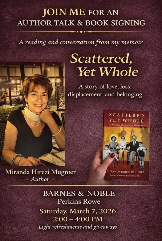 Baton Rouge Arab-American author Miranda Hirezi Mugnier will host a book discussion and signing for her memoir Scattered, Yet Whole – Six Shores, One Heart, a sweeping life story that begins with the Iraqi invasion of Kuwait and spans decades across the Middle East, India, and the United States.